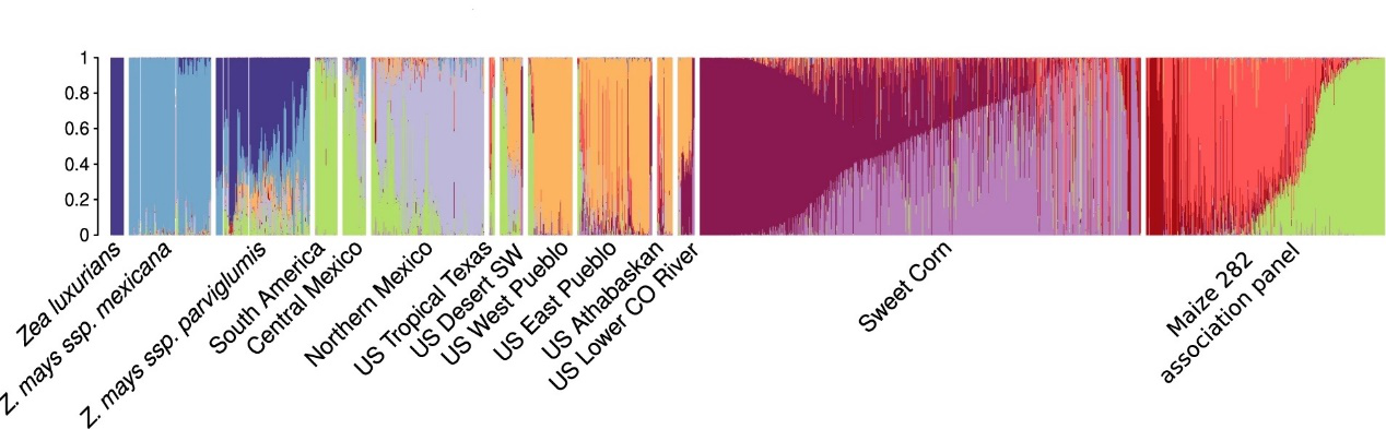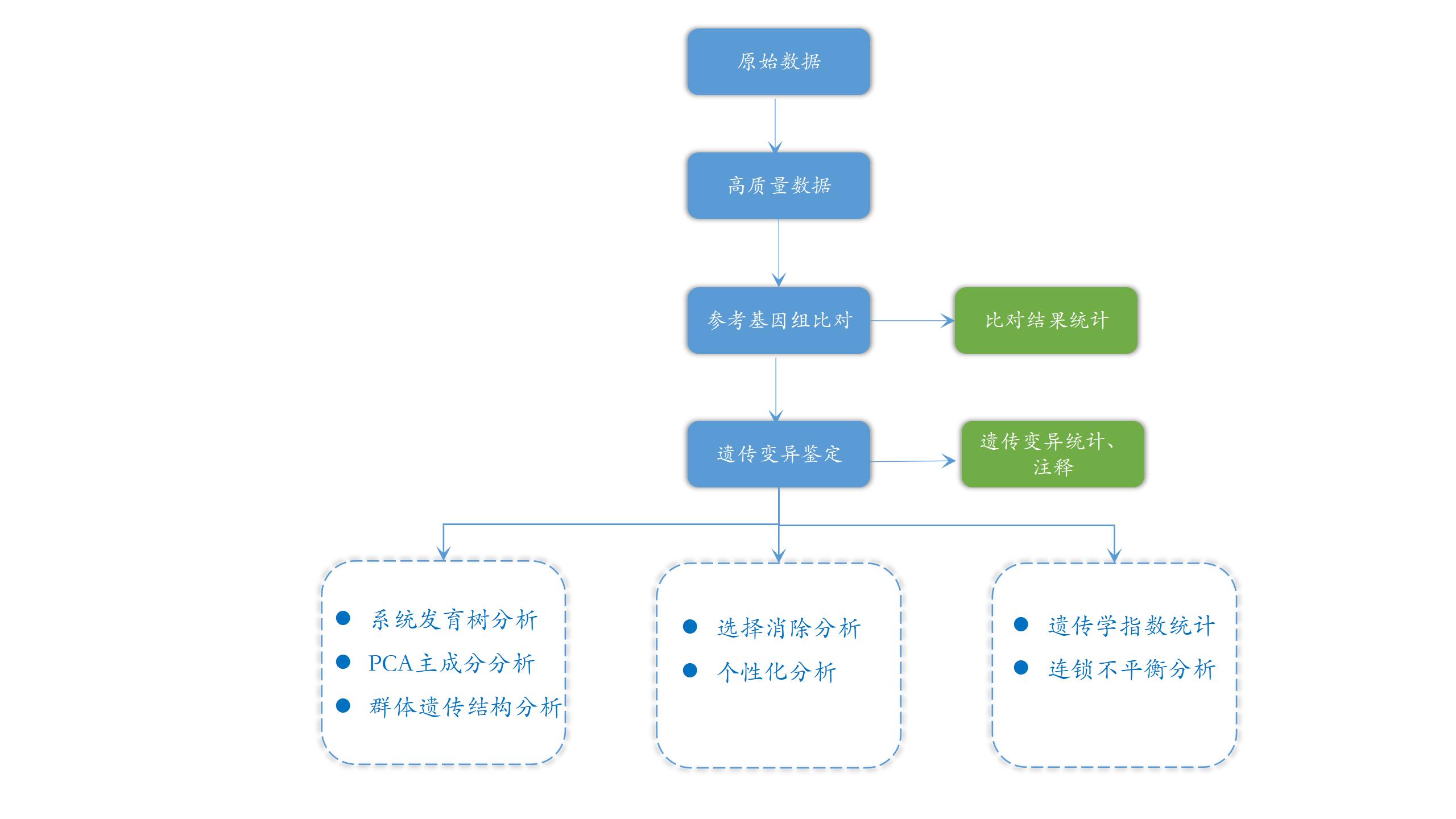 通过全基因组重测序或者简化基因组测序技术,获得不同群体的大量高准确性遗传变异信息(如SNP、Indel等),并基于此探究群体的起源、遗传结构、基因交流以及适应性进化等生物学问题。