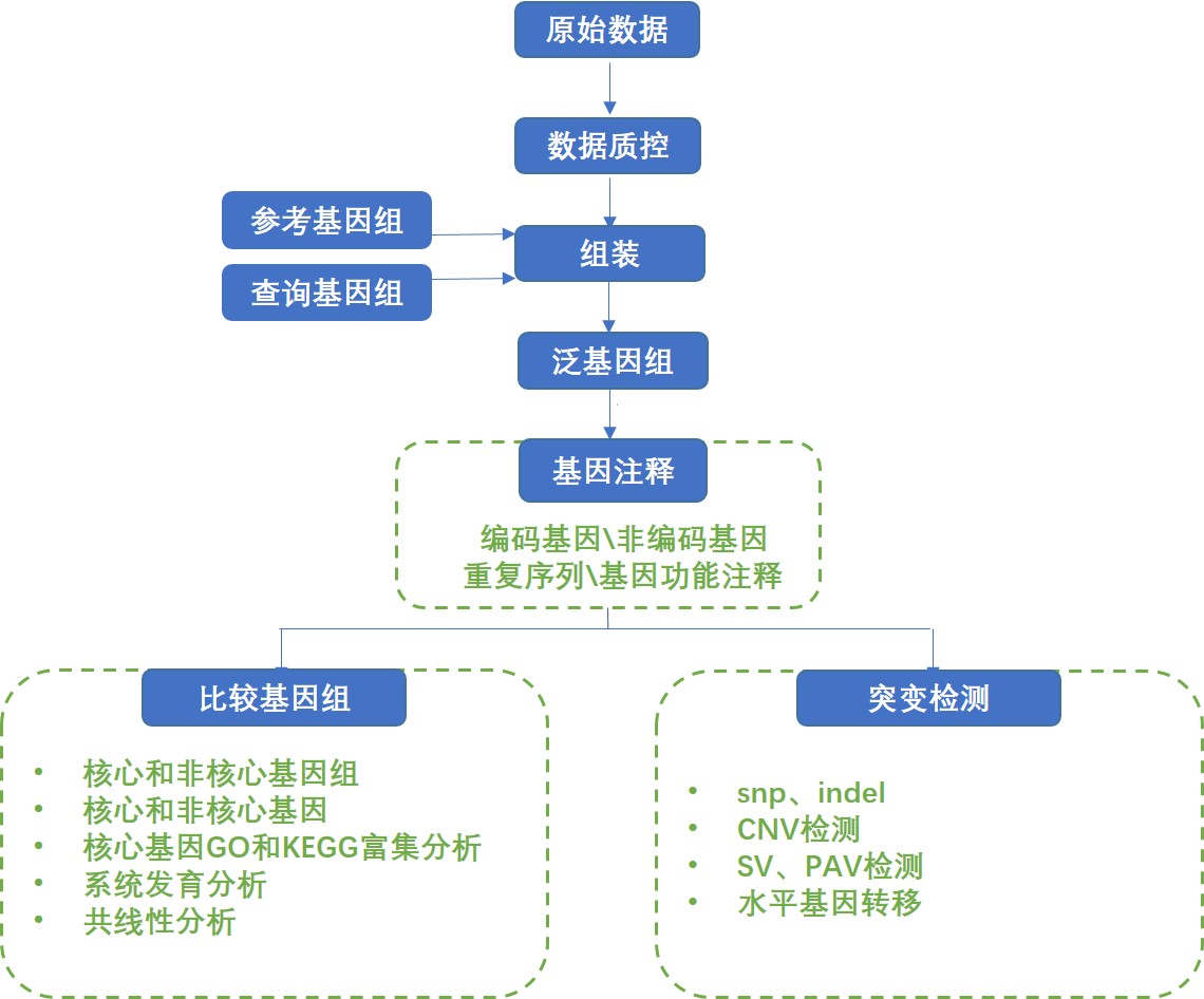 微生物泛基因组(Pan-genome) 即某一物种种内全部基因的总称。泛基因组有多个研究方向包括检验材料的代表性、区分核心基因组和非核心基因组、遗传变异研究、多组学结合等,能够从多方位解释物种的特征,挖掘更多物种的信息。泛基因组分析可以全面地对物种种内遗传多样性进行研究,探究不同个体间的进化关系。