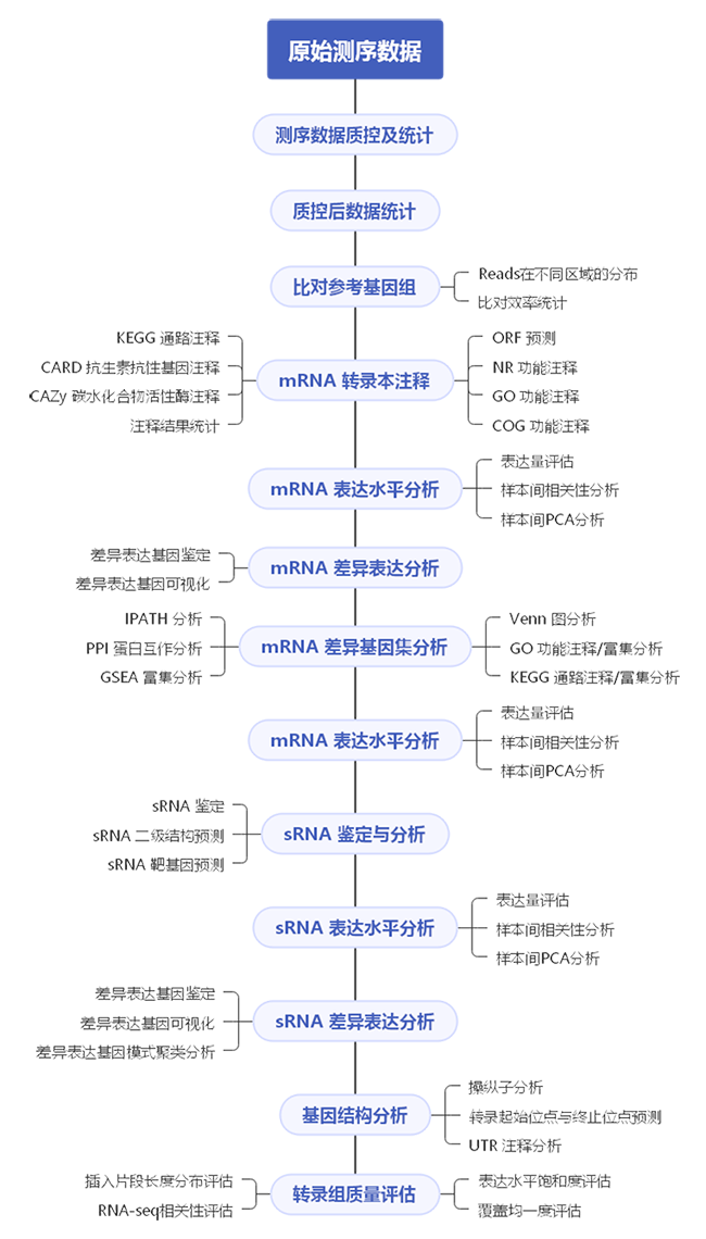 原核转录组测序是研究原核生物在某个时期或者在某种环境条件下转录出来的所有mRNA。 微生物在特定生境或时期中会表现出基因表达差异性, 以此应对环境变化。 经过去除核糖体RNA、 构建链特异性文库等实验步骤,基于Illumina测序平台,构建链特异性文库,最终获得特定时期或者环境下微生物体内所有转录本(包括mRNA, 非编码RNA等)的表达量差 异和结构信息以及功能特征, 从而找出关键功能基因解答更多微生物功能谜题。