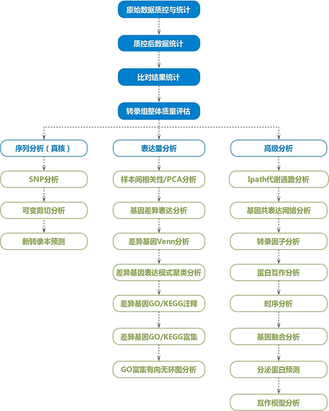互作转录组,无需分离两物种,避免分离造成的干扰,只构建一个转录组文库便可得到两物种的信息。同时,还可以通过互作模型图获得物种间基因的调控关系,得到两物种间的相互作用机制。真核 - 真核互作采用 ployA 富集方式建库;真核 - 原核互作采用去除核糖体 RNA 链特异性方式建库;原核 - 原核互作采用原核链特异性方式建库。提供除标准分析外的 WGCNA、毒力因子注释、蛋白相互作用网络等配套高级分析深度挖掘种间信息。