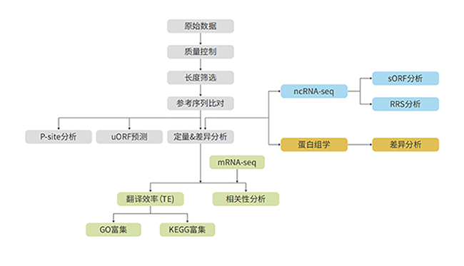 翻译组测序是指对与核糖体结合的正在翻译的RNA片段进行测序,来准确获取样本中所有可翻译分子(包括mRNA和其他潜在可翻译RNA分子如lncRNA, circRNA等)的信息与精确定量,得到被核糖体保护的正在翻译的RNA片段(ribosome footprints, RFs),然后对这些RFs进行富集、测序与分析。翻译组测序可以研究细胞内基因翻译的水平、区域、速率等,结合转录组、小RNA测序、蛋白组等进行关联分析,可以更精确地研究转录后调控、翻译调控机制。