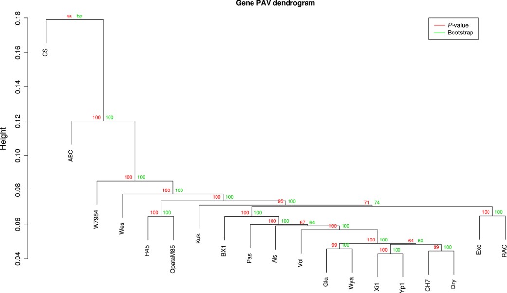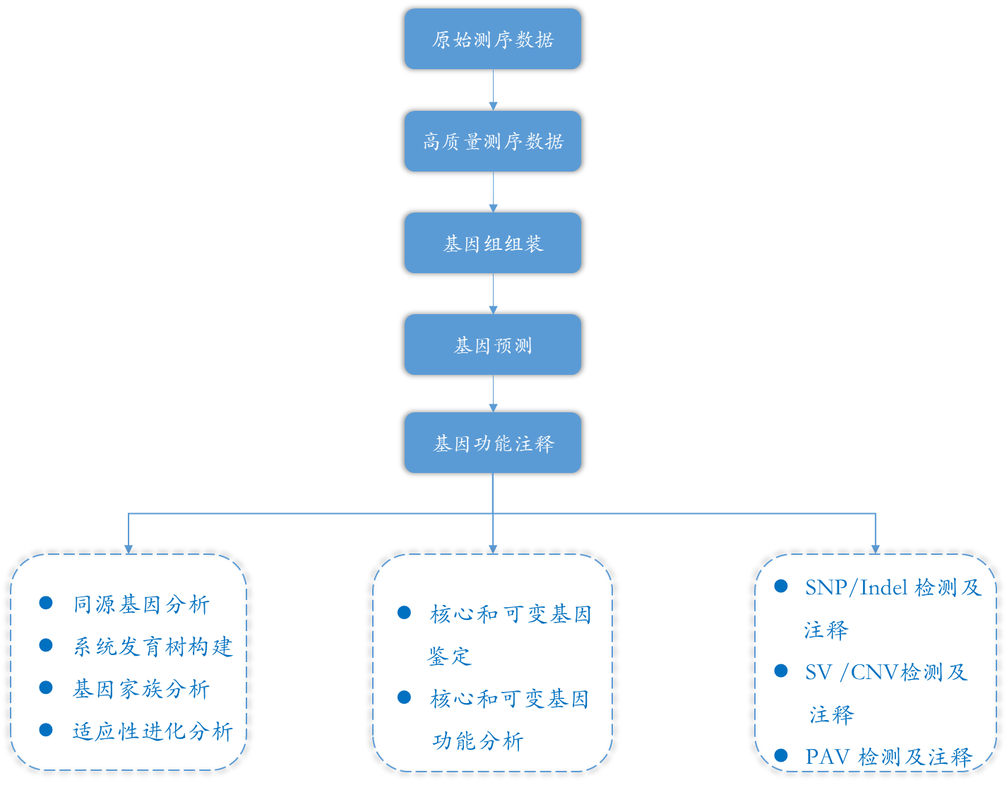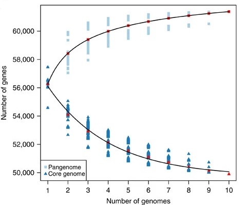 泛基因组即同一个物种全部个体基因组的总称,包含了不同个体之间共有核心基因和可变基因,能够反映同一物种不同亚种或者变种的遗传信息变化。通过比较基因组和遗传变异分析,可以得到不同个体的特有片段差异和序列碱基差异,以此来揭示个体之间表型性状差异的分子机制。