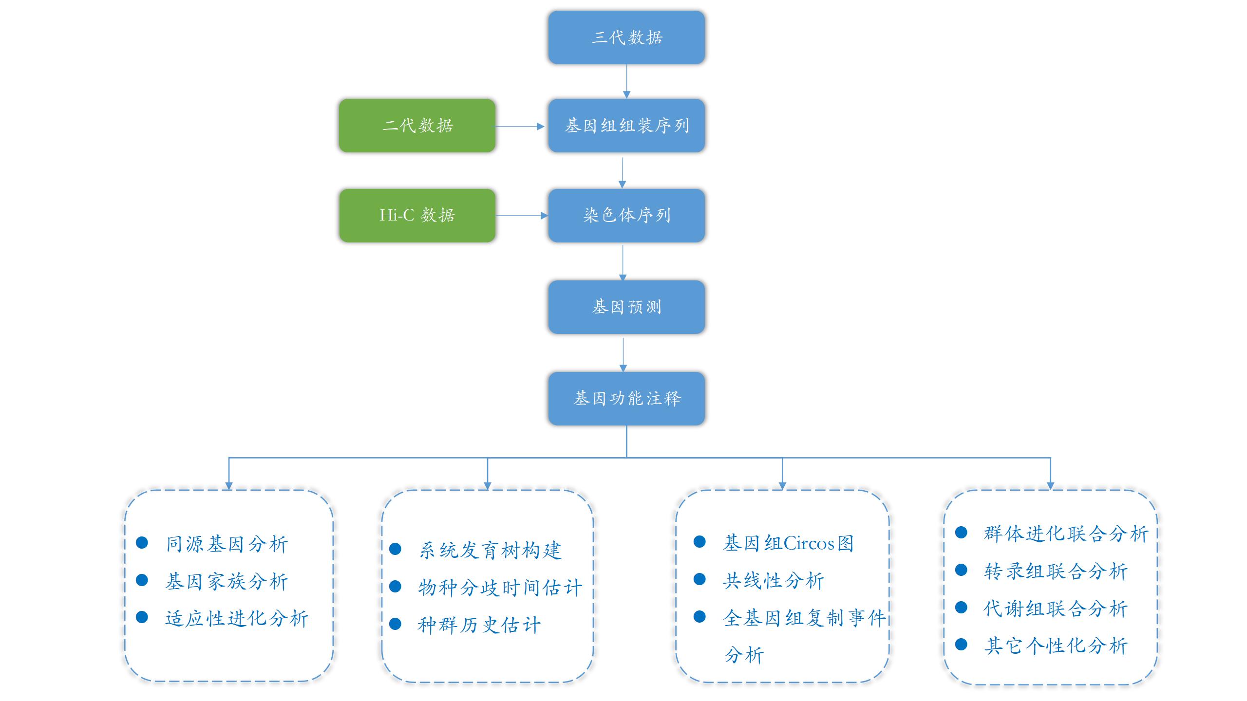 在不依赖参考基因组的情况下,通过新一代测序技术(如Pacbio Hifi、Hi-C等)获得动植物细胞核内基因组全部序列信息,并基于此研究物种演化关系、基因组进化和分子进化等。同时,为该物种构建一个全面的研究平台,推动后续的功能基因挖掘、分析以及实验验证。